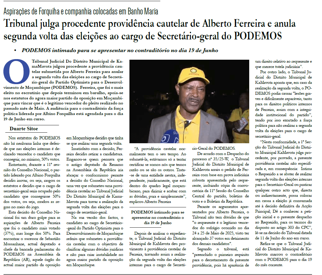 O Tribunal Judicial de KaMavota foi claro. O partido “absten-se de realizar segunda volta” e de qualquer acto que ponha em causa “a eleição já consumada” de Alberto Ferreira, até haver sentença definitiva. Quem desobedecer arrisca sanções judiciais. Com esta decisão, o juiz fecha a porta à manobra política ensaiada pela direcção de Albino Forquilha para impor novo escrutínio, alegando falta de maioria absoluta. A crise interna mudou de patamar: já não é um braço-de-ferro dentro do partido, é matéria de ordem judicial.